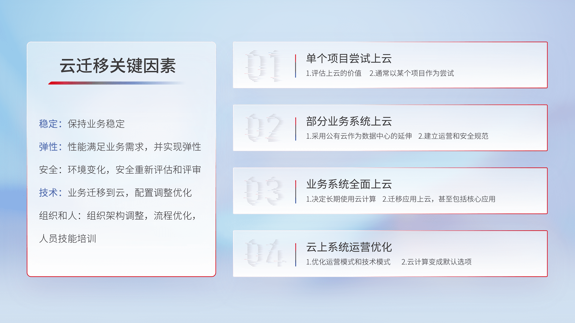 结合实际业务,,从规划设计、、云平台选型、、、、云原生改造、、数据迁移、、集成交付,,,迁移全过程为客户识别最佳上云路径,,,,做好风险识别管理,,,,设计网络架构、、、、身份权限、、、、安全审计合规、、、操作审计、、日志审计、、监控告警策略、、多站点容灾设计等,,,,对云上基础设施进行整体规划,,提升IT治理水平,,,,以满足弹性、、、、高可用、、高性能的需求。。。