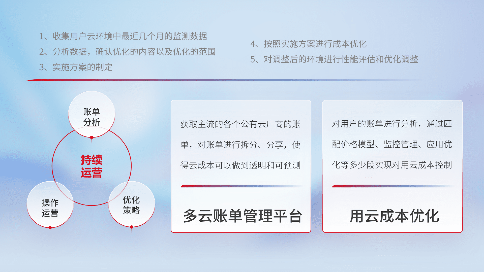 通过多云纳管,,,以统一的资源数据模型把客户的云资源进行抽象和封装,,进而实现对多云资源的统一操作,,,,保障云资源管理的可靠性、、稳定性与可用性。。。量身定制化运维内容,,,,配置、、、、开发运维、、、、补丁管理、、备份、、、、监控、、、、认证和访问管理、、、审计和日常巡检等,,,,保障在用云过程中的可靠度,,稳定度以及高可用率。。。。
